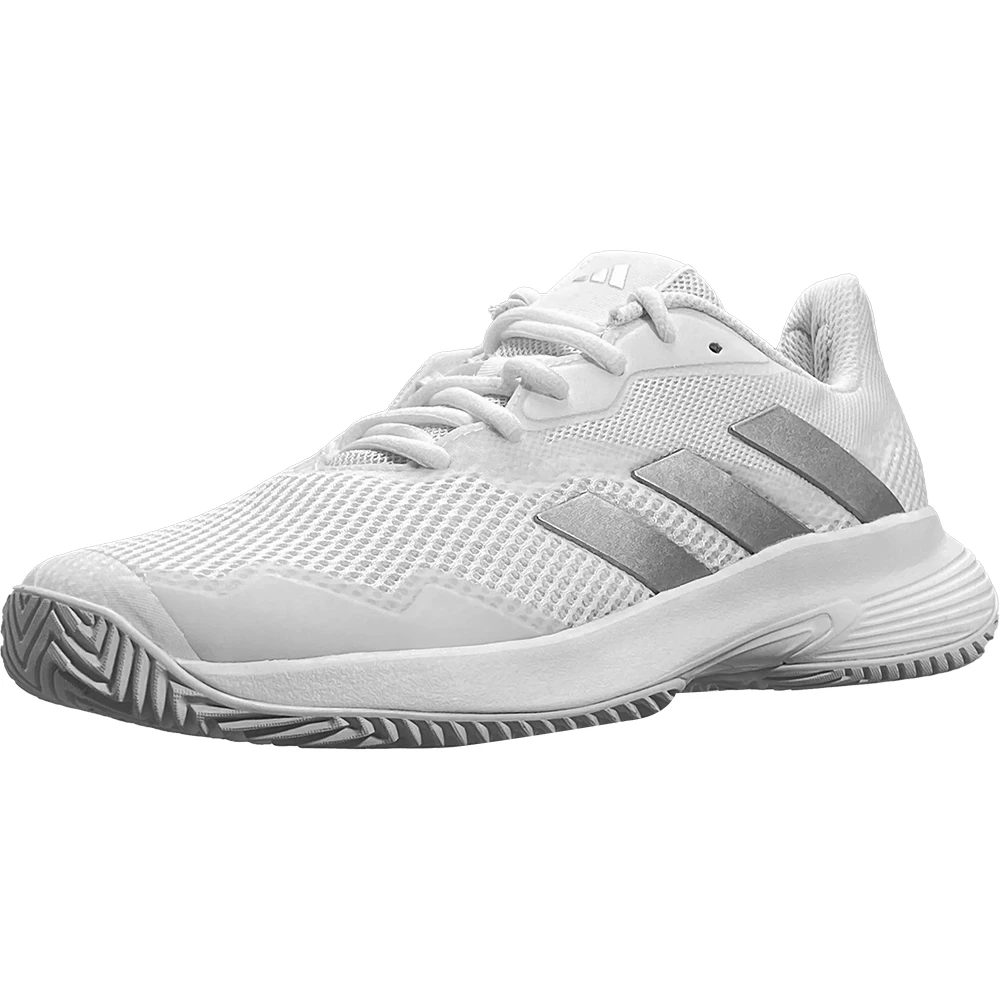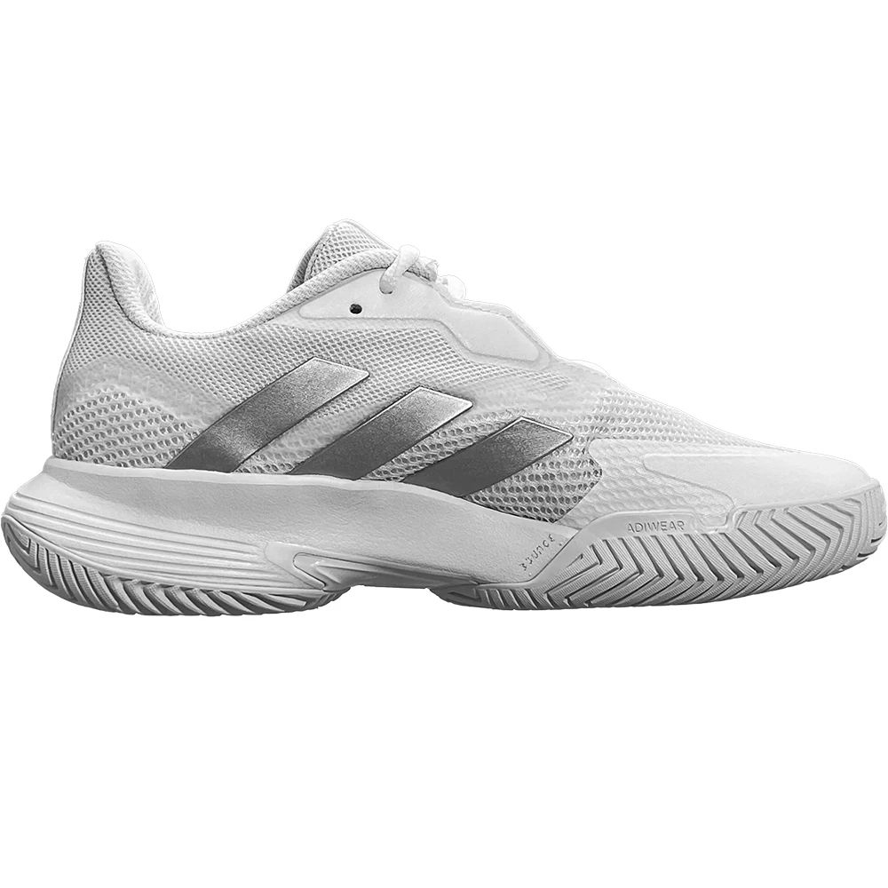 Created to help you dominate hard courts, these tennis shoes have a flexible Bounce midsole that cushions landings and a TPU midfoot shank for stability through slides and sidesteps. Hidden lacing and abrasion zones specifically configured for the women’s game means they’ll take everything you can throw at them. Made with a series of recycled materials, this upper features at least 50% recycled content. This product represents just one of our solutions to help end plastic waste. Colour Shown: Cloud White / Silver Metallic / Cloud White.