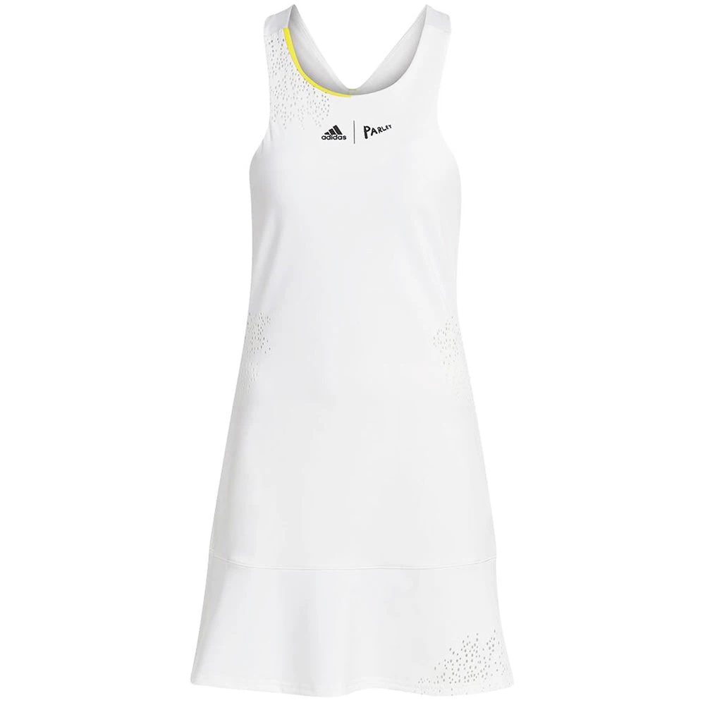 Serve for the oceans in a tennis dress that puts the problem of plastic waste under the microscope. Part of an adidas collection created for the green grass of South-West London, its Morse Code-inspired details tap out a message about the plight of our blue planet. Focused on comfort, this dress has a super-soft feel and includes moisture-wicking AEROREADY. Its Y-strap is ergonomically designed to give you room to play your all action game. Integrated inner bra. Inner tights. Round neck. Slim fit. Fabric: Dress: 70% recycled polyester, 30% elastane raschel. Colour Shown: White.