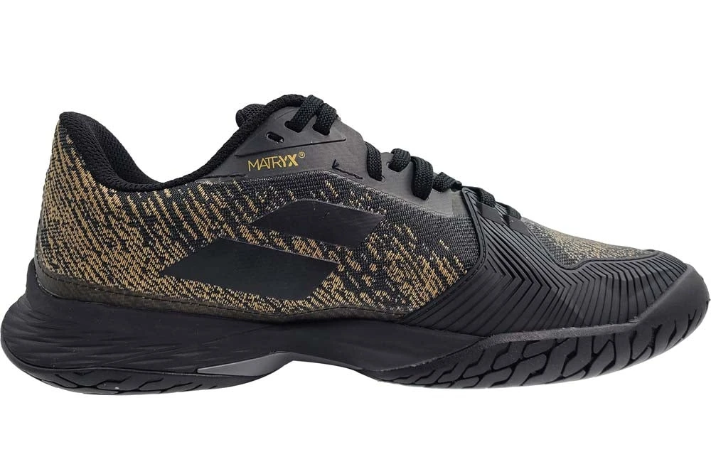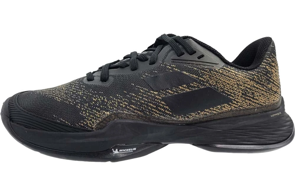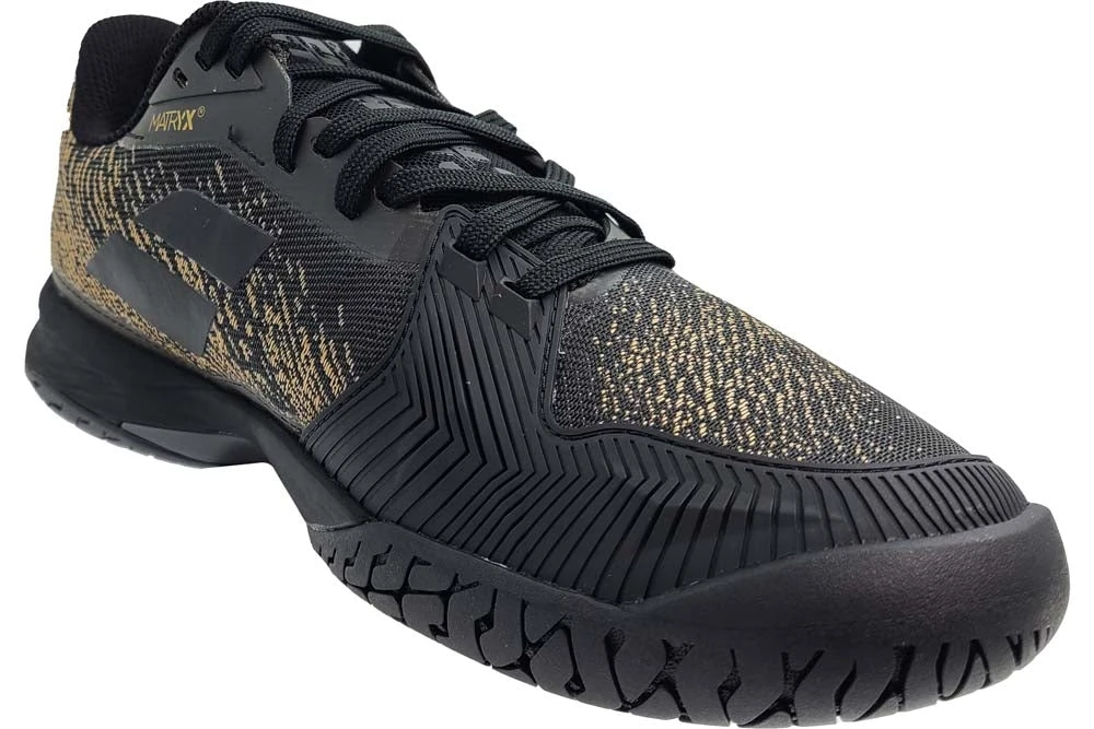 The Jet Mach 3 offers a 2-piece Matryx®SL version of the woven upper made with polyamide fibers and Kevlar® inserts, making it lightweight, supportive and breathable. Excellent shock absorption with the Ortholite® memory insole and Kompressor system. The Active Flexion and Michelin outsole (traction and durability) provide rebound. Its innovative design makes it the ideal shoe for all young competitive players. Colour Shown: Black / Gold.