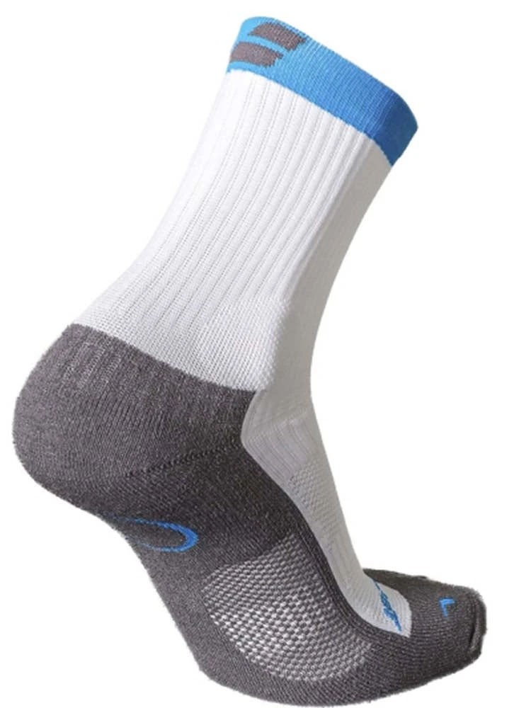 Tennis is a very demanding sport for the foot. This Babolat Men’s Pro 360 socks was specially designed to meet tennis players’ very specific needs. Ventilation at the arch and on top of the foot. The wide elastic band around the ankle provides better support. Several sections of the sock offer protection against impact and wear: there is cushioning under the sole of the foot, protection at the Achilles tendon and anti-wear as well as tear cushioning toe at the first metatarsal and heel. Anatomical left and right foot. 1 package contains one pair of socks. Colour Shown: White / Blue.