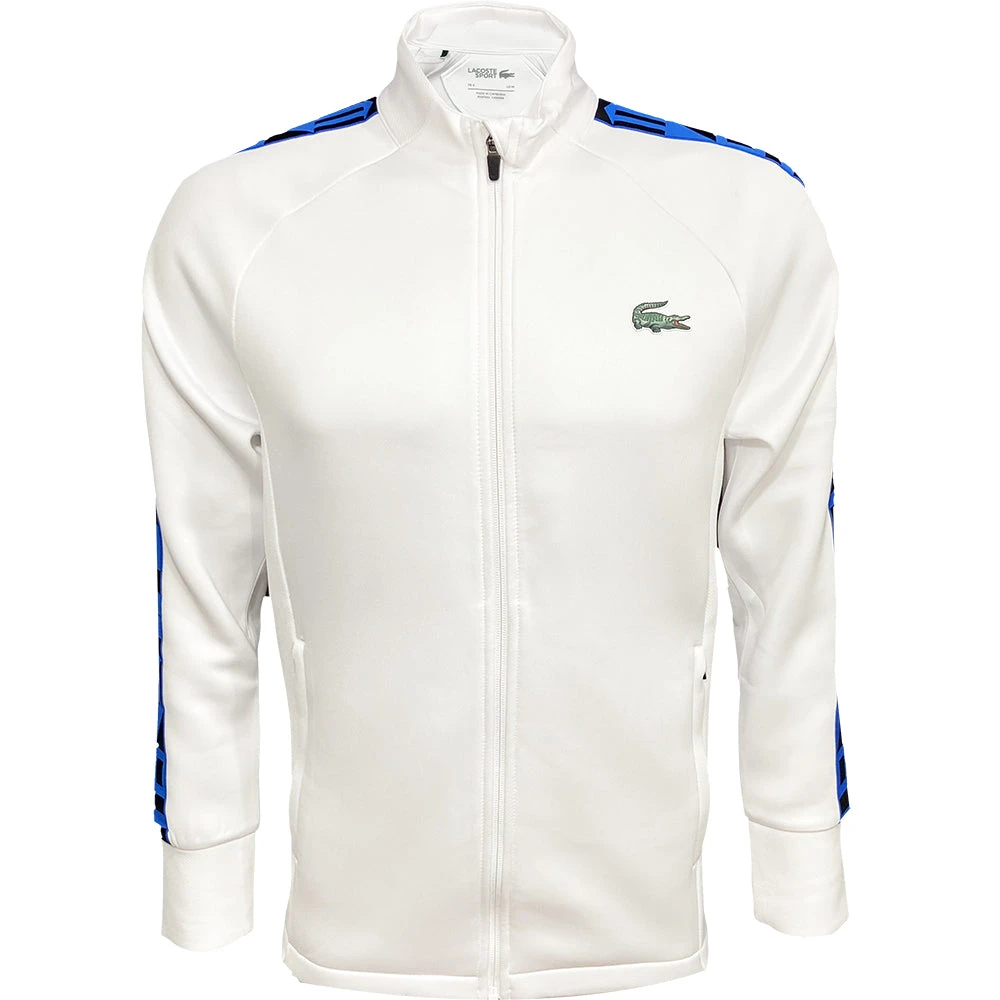 Assert your sporty style with this zipped sweatshirt. A breathable model, enhanced with graphic contrast stripes. Stand-up collar: Protects and keeps you warm. Side zip pockets: Keep your essentials within reach. Nautical printed bands on sleeves: Lacoste, on both land and sea. Rigid crocodile sewn onto chest: A signature Lacoste silhouette. Jersey: Soft. Lightweight. Comfortable. Fabric: Main fabric: Polyester (90%), Elastane (10%) / Band: Polyamide (58%), Polyester (28%), Elastane (14%). Colour Shown: White.