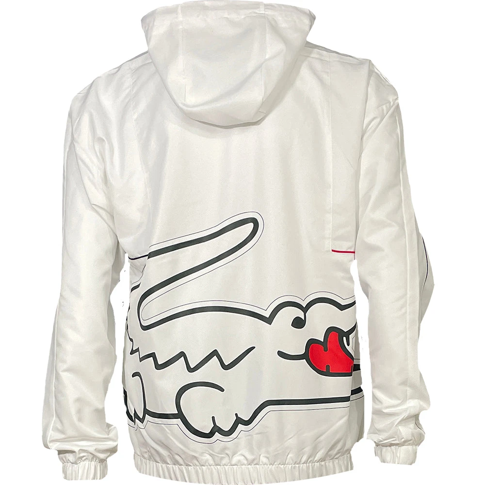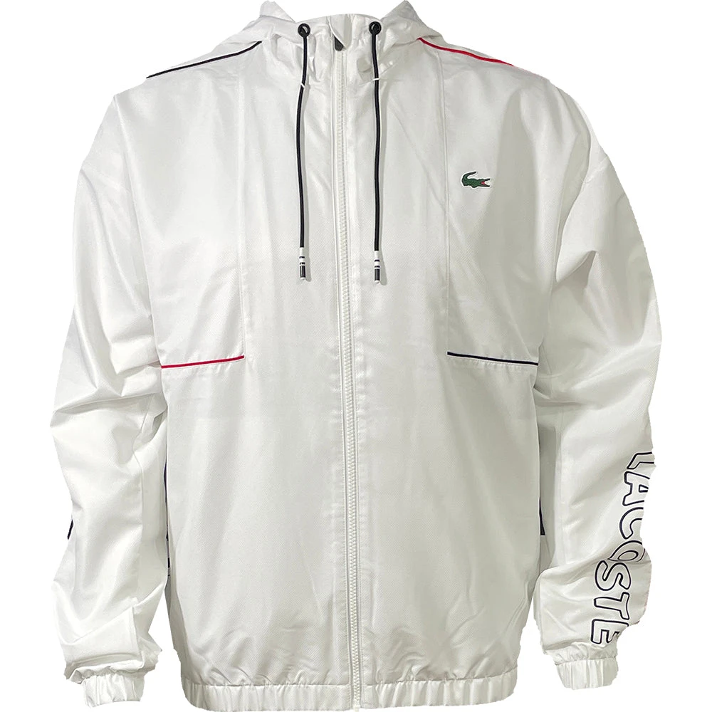 A bicolor design, contrasting piping, an oversized crocodile and oversized brand lettering bring a snazzy look to this stylish Lacoste Sport tracksuit. Convenient pockets and elasticized finishes complete this trendy, comfortable look. Recycled polyester diamond weave taffeta and mesh lining. Stand-up collar solid zip jacket with contrast drawstring, front pockets, elasticized wristbands and bottom of garment. Contrast piping on sides of shoulders and sleeves, oversized crocodile on back of jacket, oversized Lacoste branding on sleeve. Green crocodile transfer on chest. Fabric: Main fabric: Polyester (100%) / Lining: Polyester (100%). Colour Shown: White/Black/Red.