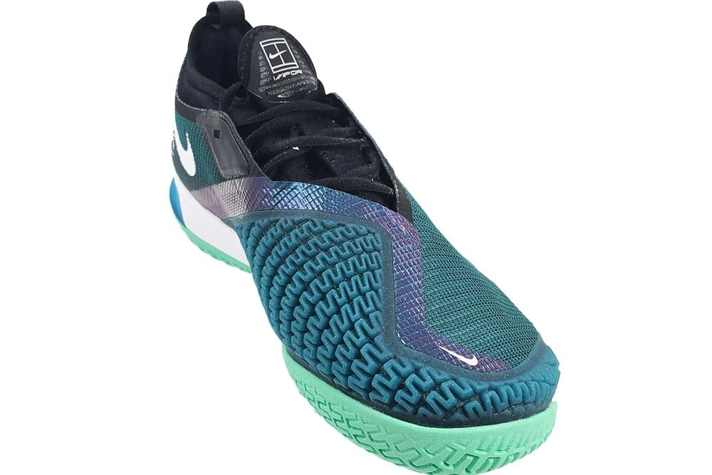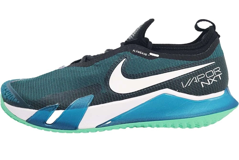 Meet the next generation of tennis performance. Built using years of athlete data, the NikeCourt React Vapor NXT brings top-notch traction and an innovative cushioning system, so you can play at your best during your fastest and fiercest matches. Similar to the Vapor Cage 4, it utilizes durable rubber and plastic in high-wear areas, and the laces on the medial side are shielded. There is also a sock-like fit with attached tongue, and a new herringbone outsole. Designed for wear on hard court surfaces. Removable insole. Heel pull tab. Colour Shown: Dark Teal Green / White / Black / Green Glow / Volt.