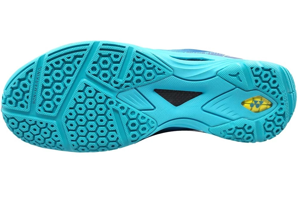 The Yonex Aerus Z badminton shoe is an upscale model that combines the latest technologies to provide players with the performance, comfort and durability they demand. This shoe is widely used on professional tours. Cushioning made of Power Cushion (3 layers) absorbs shock extremely efficiently to prevent muscle fatigue and injury in addition to providing a high level of comfort. 3D Power Carbon technology, which consists of a carbon insert at the middle of the sole, makes the shoe extremely stable and cuts down on twisting in the shoe. The Durable Skin Light combines rubber-like flexibility with the stiffness of hard plastic and lets you play light on your feet while maintaining a robust fit. Other technologies, such as Full Cushion Sole + S, the Toe Shape Assist, the Flexion Upper and the Quattro Fit provide comfort for the foot and toes, improved support, an effective lacing and improved footwork. In summary, the Yonex Aerus Z s a high performance shoe with a remarkable lightness that makes no compromise on stability and durability. Colour Shown: Mint Blue.